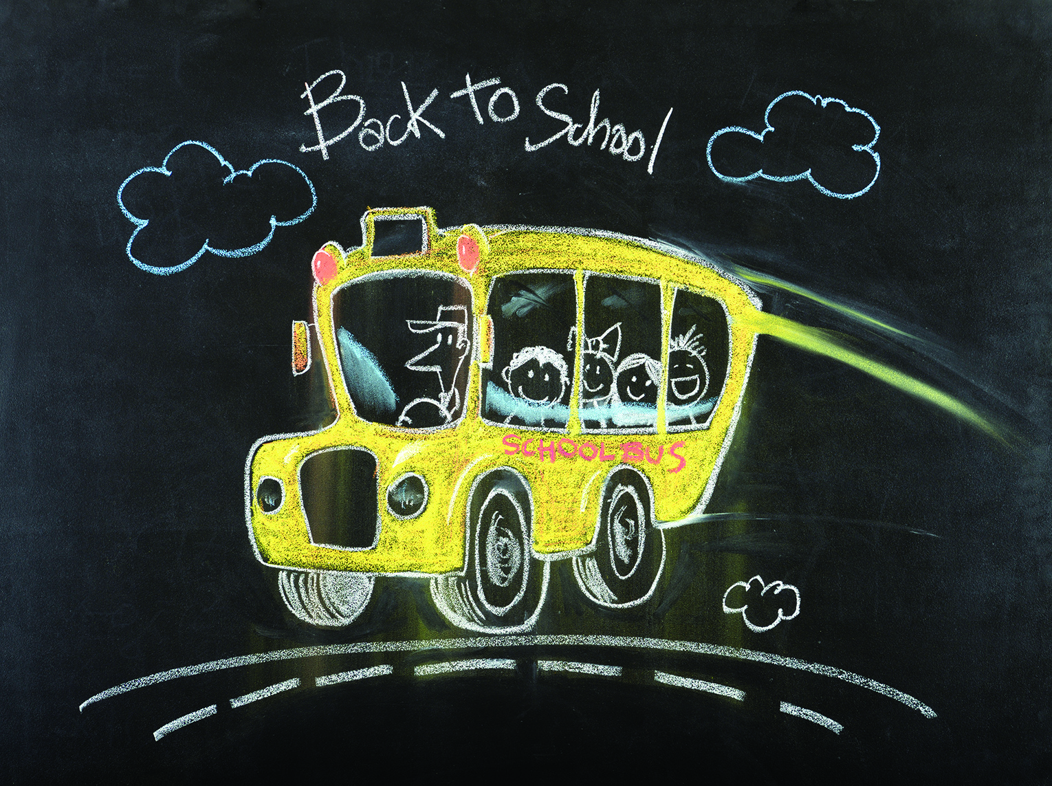 Colorful chalk drawing on a blackboard of a yellow school bus with smiling children and a driver, with "Back to School" written above.