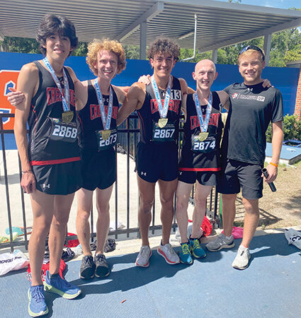 Senior Jesse Benavides blazed the final leg with about a 50-meter lead into the finish line. The event was stacked with Florida’s 18 fastest running teams, some of which had seeded times faster Creekside’s. First time runner and sophomore Tanner Simonds led the first leg, followed by veteran junior McCall Williams who created a large gap from the crowded field, where another veteran junior, Hudson Finocchio, maintained the lead on the third leg.