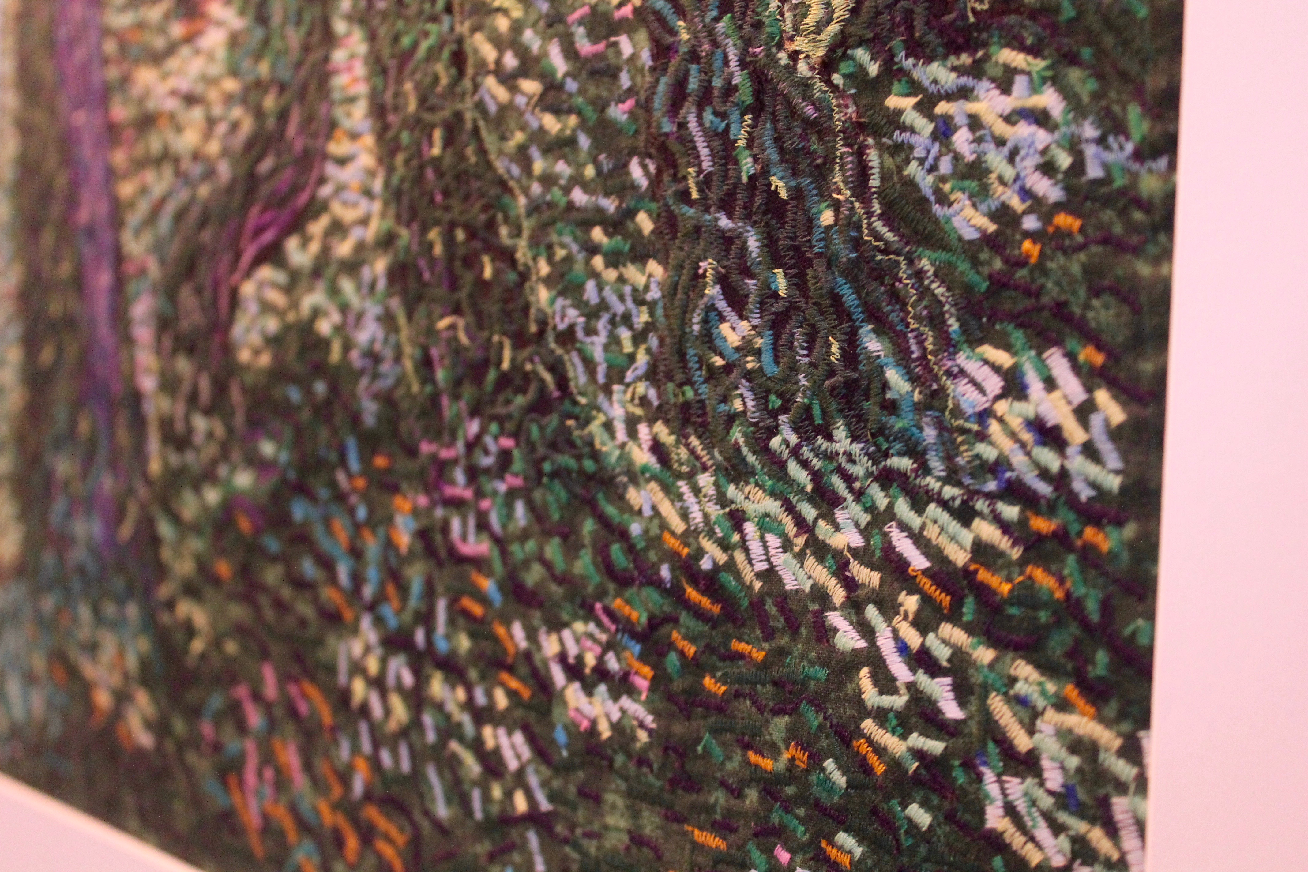Close up of Barbara Baer’s “painting with fabric and thread”