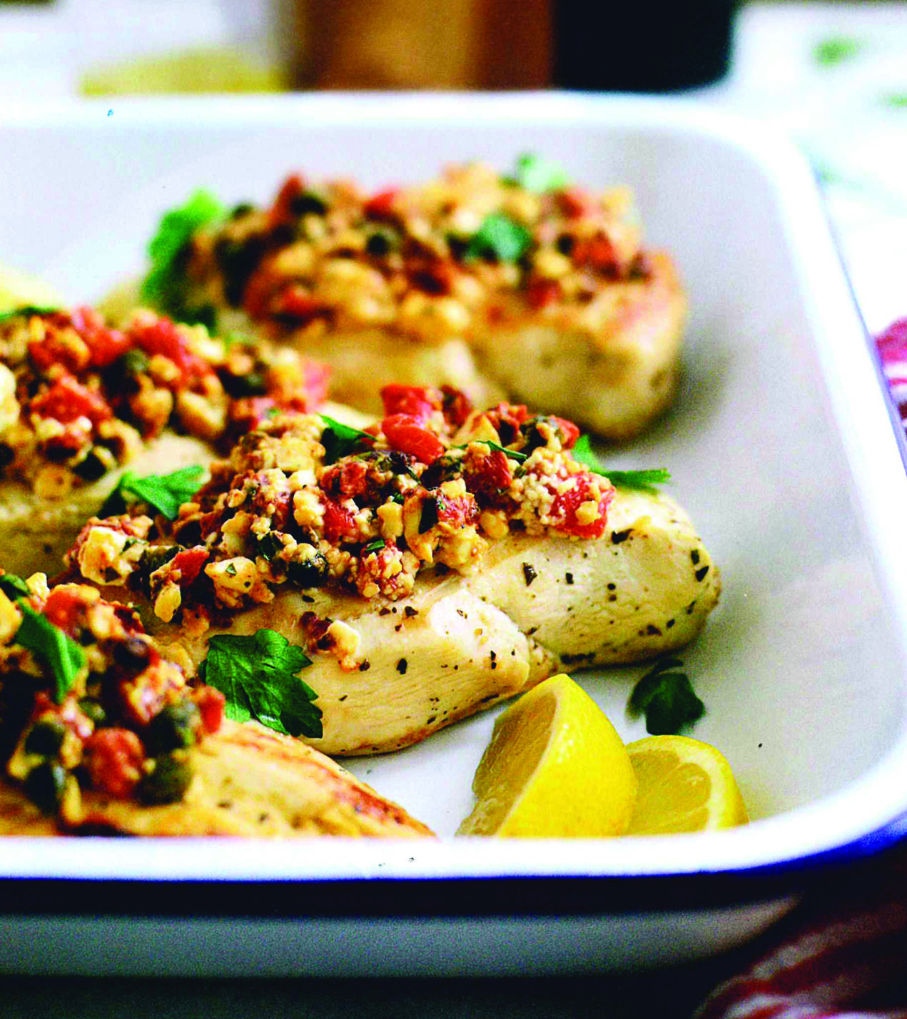 Chicken is a versatile food that can be prepared and cooked in various ways and is capable of being combined with a host of tasty ingredients. In fact, cooking and serving chicken with certain foods can pack a flavorful punch, turning an otherwise bland chicken breast into a dish families won’t soon forget. Such is the case with “Roasted Red Pepper, Sun-Dried Tomato and Feta Topped Chicken” from Laurie McNamara’s “Simply Scratch: 120 Whole Homemade Recipes Made Easy” (Avery).