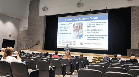 “Two items of importance to the school district are on the ballot for voters to consider,” said St. Johns County School Superintendent Tim Forson at a community meeting held at Bartram Trail High School on Sept. 30. “And they both have to do with growth. Growth in our school system is inevitable; it’s part of who we are the past 15 years and will likely be for the next 15 years as well.”