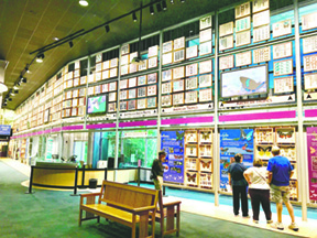 Before entering the Butterfly Rainforest, visitors pass several live video cam screens displaying thousands of monarch butterflies in Mexico. Then, guests approach a kaleidoscope of color that simply wows. A massive glass wall showcases hundreds of spectacular butterfly specimens allowing close-up inspection of the colorful wing patterns and designs.
