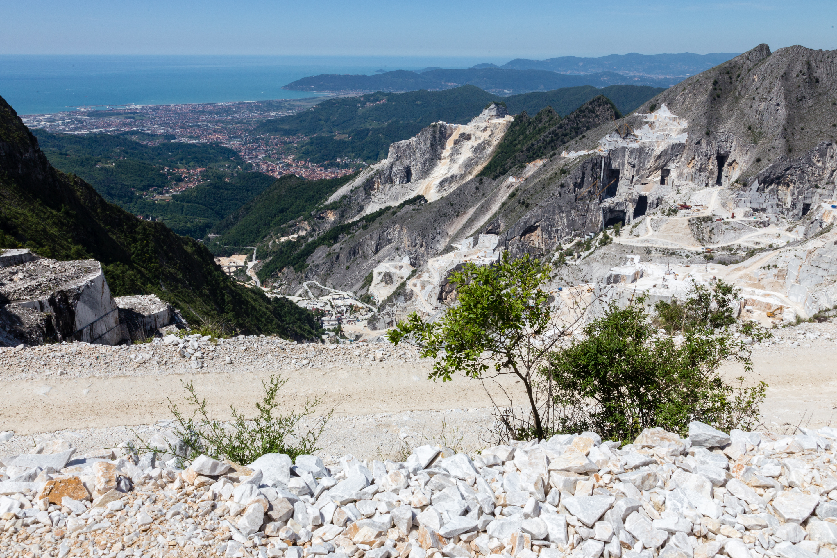 When the Jeep landed at the mountain’s summit, I felt like I just jumped off the top of a ski lift. My fellow passengers and I drank in the panoramic view of the Apuan Alps along with the Tuscan coastline and the town of Carrara. As I spun around, I felt humbled surrounded by the white marble facings hewn from centuries of labor. The open-air quarries look like a giant’s staircase to the sky.