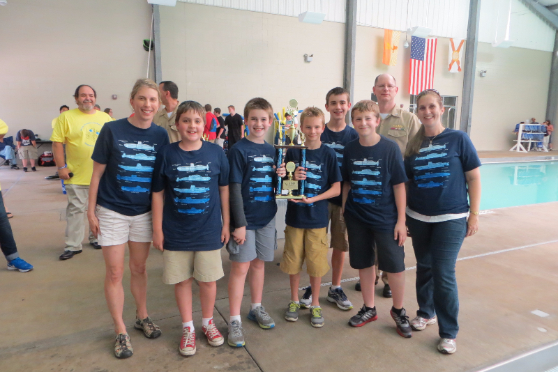 Chuck Hayes, one of the organizers of the Greater Jacksonville SeaPerch Competition; co-coach Julie Myers, Thomas Read, Ryan Vogel, Logan Myers, Price Drawdy, Alex Sobol, Coach- Katie Vogel. In dress uniform is Commanding Officer of SERMC, Capt. Dave Gombas.