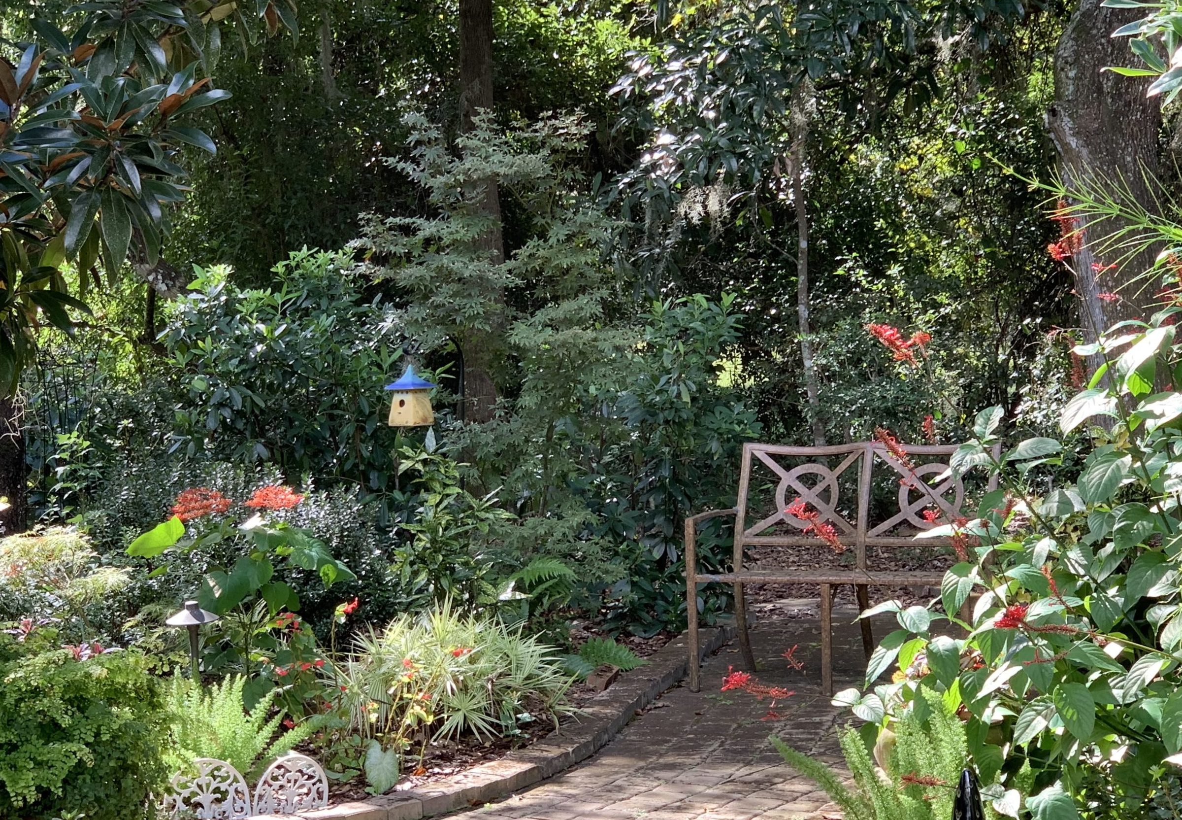 The winner of the 2020 Mandarin Garden Club’s National Gardening Award is Betsy Hogan, who has created a lovely and colorful respite area that would be calming and pleasant for anyone. The curved path invites visitors to a restful, peaceful seating area surrounded by colorful flowers and lush greenery. This calming, cool, vision of relaxation draws one up the path to a lovely bench — where one can watch the birds, dream problems away, and focus on the beauty of nature.
