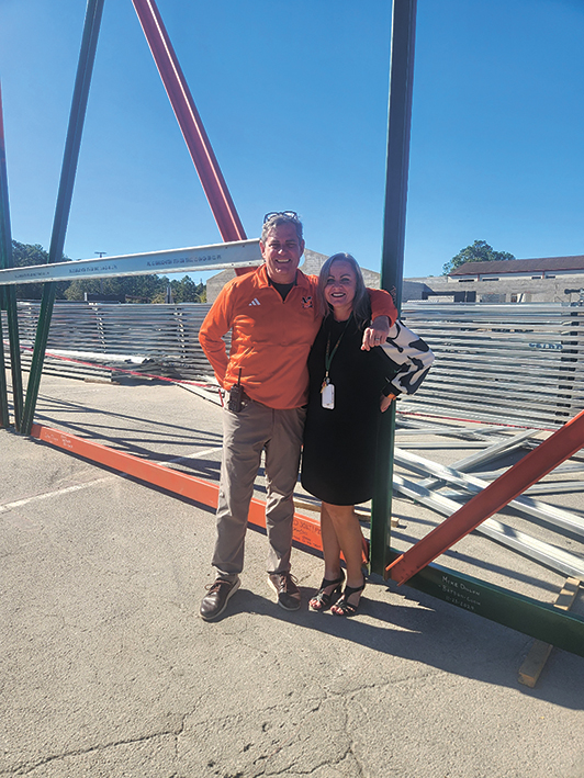 Assistant Principal Tim Durkin and Principal Sara Bravo with a ceremonial truss during a “topping out” to signify the last of the roof trusses going onto the new building.