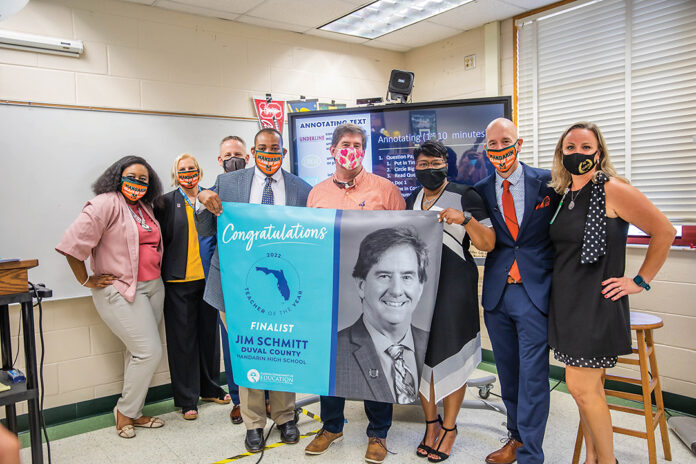 During a surprise visit to Mandarin High School on May 4, the Florida Department of Education announced that history teacher James Schmitt is a 2022 Florida Teacher of the Year state finalist. On hand to make the announcement were K-12 Public Schools Chancellor Jacob Oliva and Deputy Chancellor for Educator Quality Dr. Paul Burns. The 2022 Florida Teacher of the Year will be named on July 22 in Orlando.