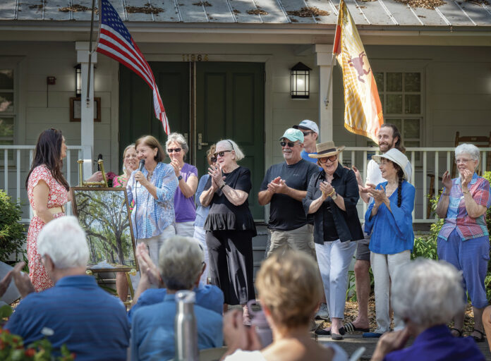 The board of directors, along with newly-hired Executive Director Brittany Cohill and Volunteer Coordinator Paula Suhey, presented Arpen with a custom printed and framed Olis Garber original photograph of Mandarin’s oak canopy over Brady Road — her favorite in Garber’s Mandarin series. Messages of gratitude were inscribed on the back from museum friends and family. Another uniquely Mandarin gift to Arpen was a surprise performance from Music Under the Oaks musician Eric Arndt.