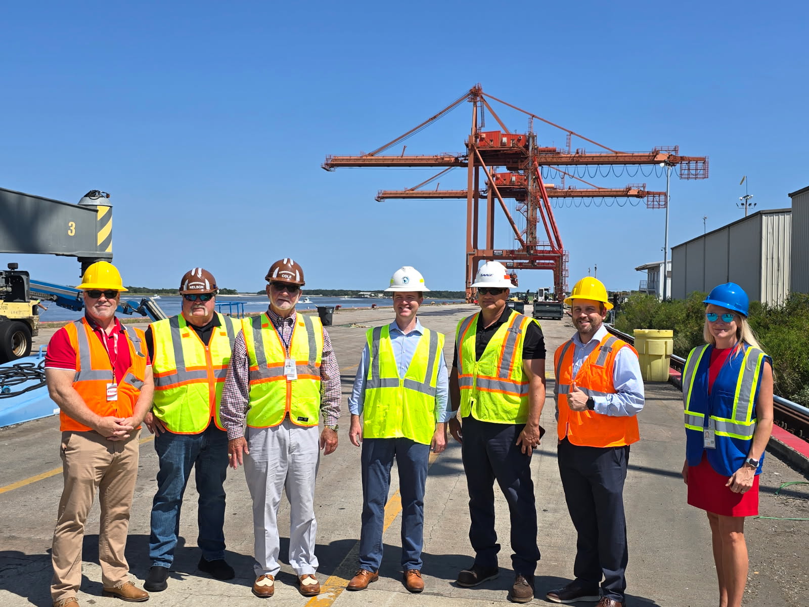 The Ocean Highway and Port Authority Commission hosted State Senator Clay Yarborough for a tour of the Port of Fernandina today. From left, Commissioners Scott Moore, Ray Nelson and Mike Cole, Senator Yarborough, Port representative, Commissioners Justin Taylor and Miriam Hill. Photo by Julia Roberts/Nassau NewsLine