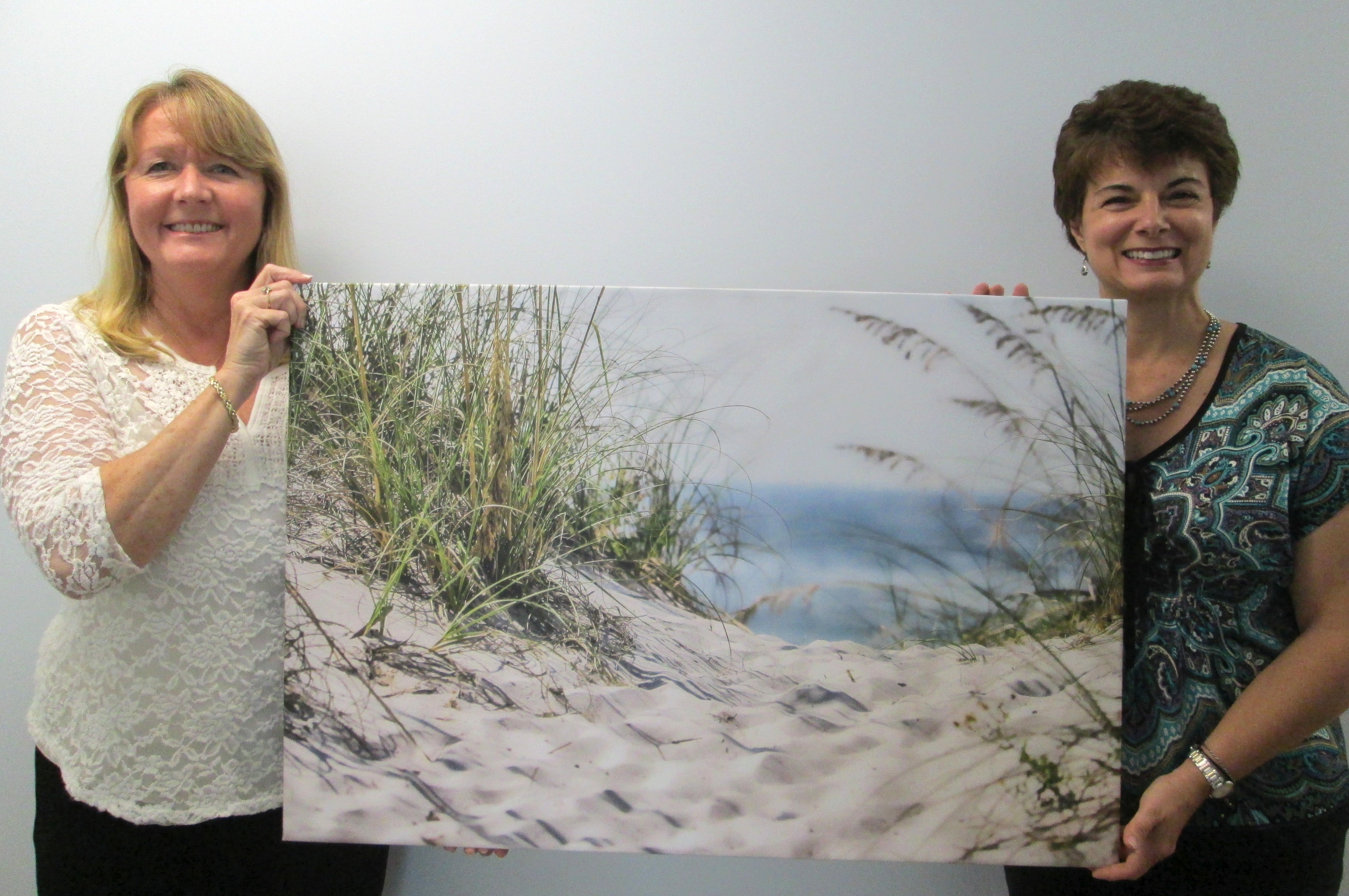 Diane Machaby of Art 4 Charities presents a piece of artwork to Lori Anderson of Mission House, the only day facility for the homeless in the Jacksonville Beach area.