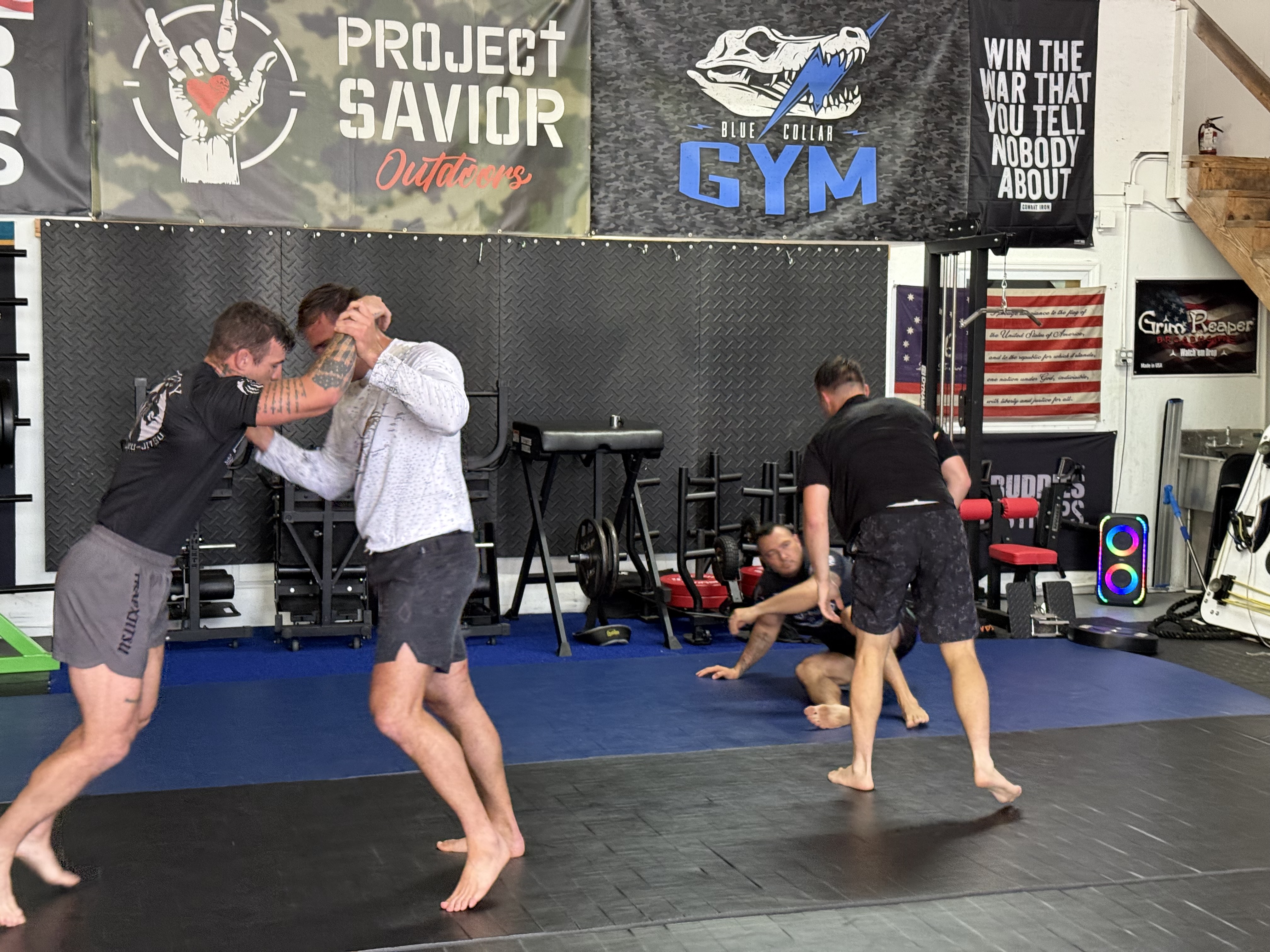 Anywhere from 35 to 45 men typically attend the Wednesday night event. They include military veterans as well as police and firefighter first responders. Led by Eli Tavarez, many show up at 5 p.m. for an hour of open mat workouts and vigorous exercise, sponsored in part by Top Tier Fitness. Food, provided by local vendors, is also provided.