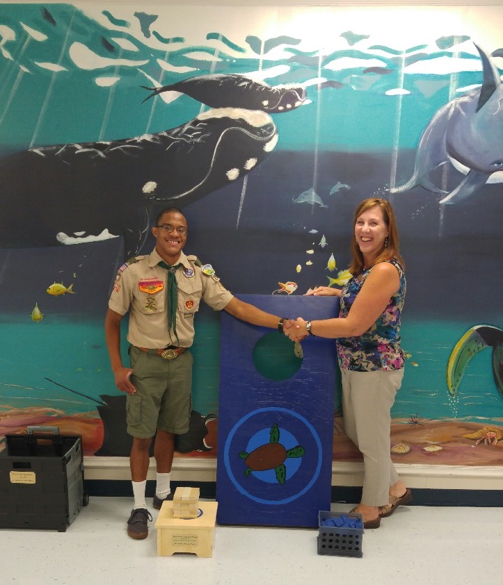 Manly demonstrated leadership by working with a team of 24 Troop 288 scouts, parents and friends to build each school a set of Jenga blocks with a stand and a corn hole toss game with the school’s logo stenciled on it.