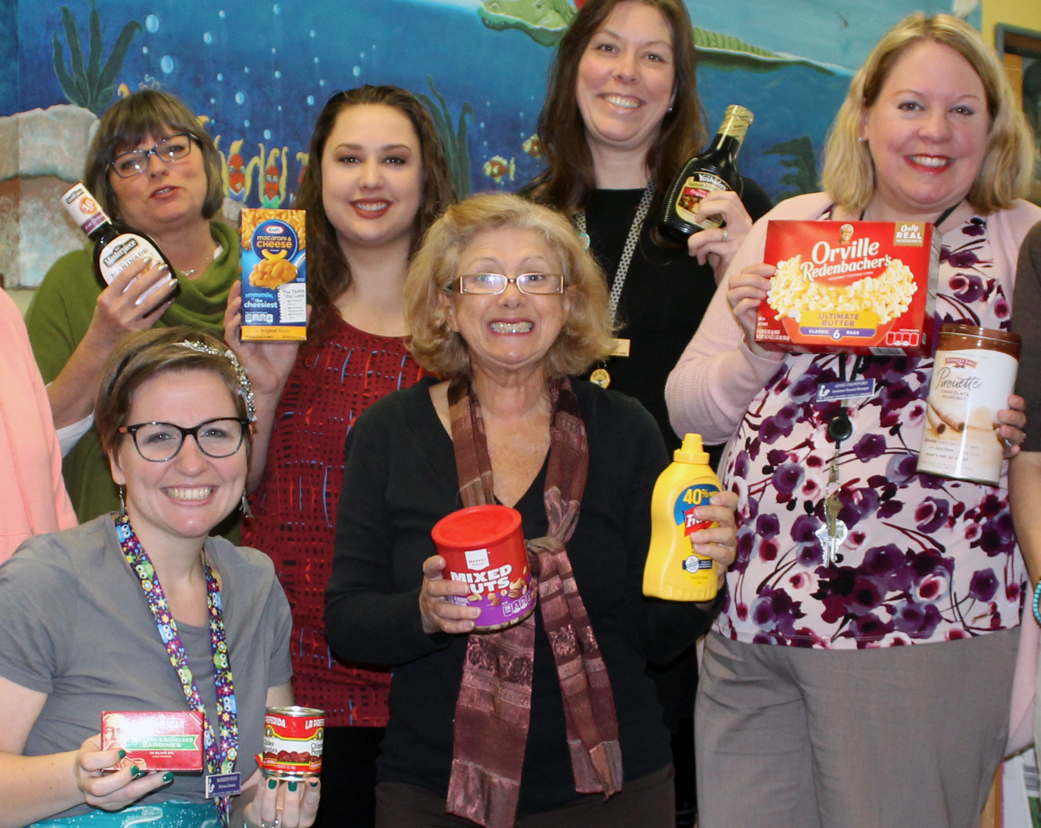 Ponte Vedra Beach Branch Library staff with some of the items donated by patrons during the Food for Fines drive.