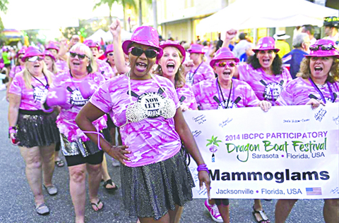 Millard, along with husband Marty, is also known for bringing dragon boating to Jacksonville. She was looking for something she could do to continue exercising and one of her In the Pink clients suggested she check out dragon boating. In 2011, Millard raised enough money to purchase two dragon boats and the Jacksonville Dragon Boat Club was formed. Today, the club has a workout facility and about 80 members of all ages. There are a number of teams, both recreational and competitive, made up of men, women, youth, mixed, and the breast cancer survivor team known as the Mammoglams.