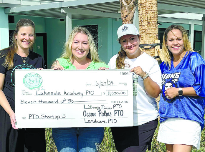 PTO presidents from Ocean Palms Elementary, Lakeside Academy, Liberty Pines Academy, and Landrum Middle School joined forces to provide Lakeside Academy PTO with $11,000 to start the school year.