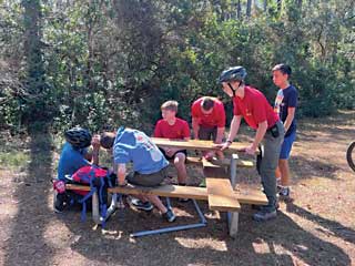 Scouts installing a picnic table kit.