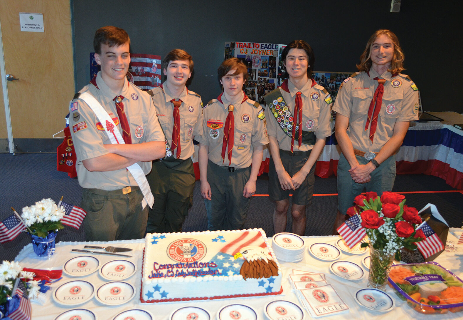 On the journey to Eagle rank, each boy scout earned 21 merit badges, served in a leadership position for 16 months, and spent numerous hours on service projects including their Eagle Scout service project totaling more than 150 hours of service.
