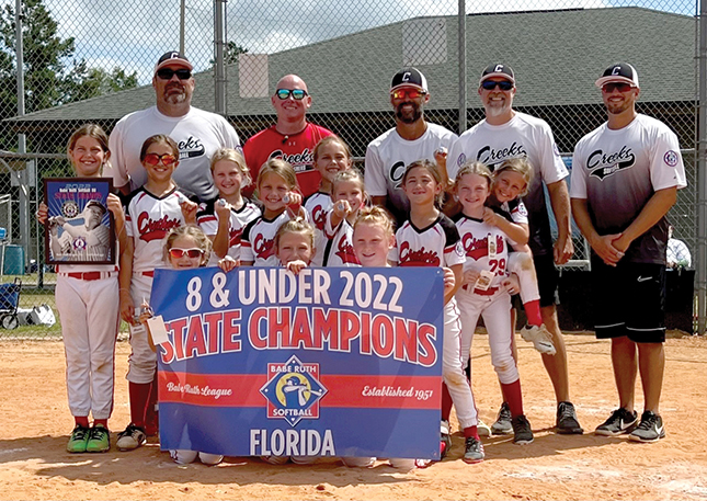 The Creeks Crushers 8U softball team won the Babe Ruth Florida State Championship, held June 23 – 27 in Lake City, Fla. During the five-day tournament, the Crushers faced little resistance as they finished with a record of 5 – 0 and outscored their opponents by a combined total of 58 – 20.