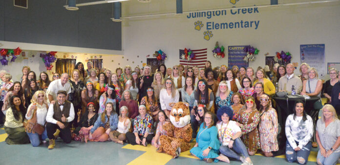 Current and former staff of Julington Creek Elementary gathered on Oct. 20 to celebrate the school’s 50th birthday. Many dressed in their “‘70s Best” and a wonderful time was had by all. Current principal, Jeanette Murphy, opened the festivities, and St. Johns County School Board member Bev Slough and St. Johns County School District Superintendent Tim Forson spoke for a few minutes about their respective histories with Julington Creek Elementary. Many former staff members and administrators were in attendance, reminiscing about their experiences at the school and the changes through the years.