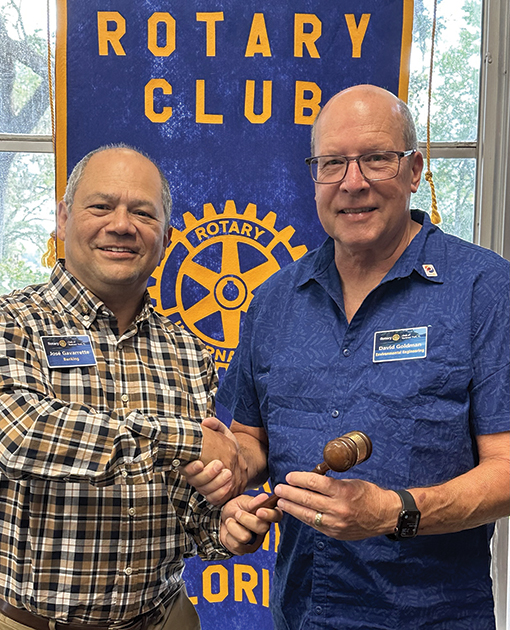 July is a time of transition for Rotary Clubs around the world, as each club turns over its leadership to a new club president, slate of officers, and board of directors. Locally, the Rotary Club of Bartram Trail – Julington Creek celebrated the beginning of the new Rotary Year with its annual “Pass the Gavel” event, as the club presidency transitions from José Gavarrette to David Goldman.