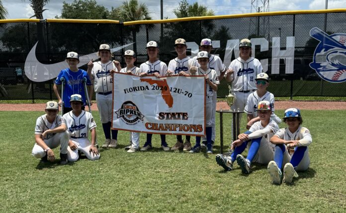 The 12u Julington Creek Diamond King Elite team won the 2024 Cal Ripken Florida State Championship on June 30 at Jax Beach. Their record was 5 – 0 and they outscored opponents 58 – 13. This is the age group’s fifth state championship at Julington Creek since they were playing allstars at five years old. Pictured are Parker Karvonen, Gavin Ramigio, Tyler North, Johnny Degrado, Zach Childers, Piercen Rumble, Mark Thompson, Jaxson Sotomayor, Cadyn Hacker, Will Campbell, Paul Fleischer, Brantlee Mullins and Tyson Jordan. The manager is Chris Thompson and coaches are David Mullins and Travis Jordan.