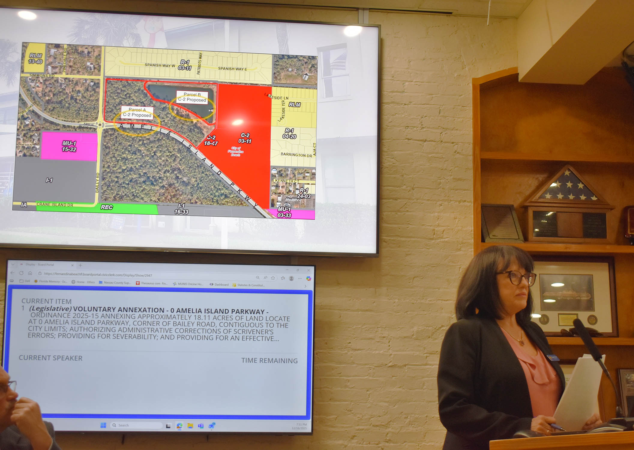 Fernandina Beach Planning Manager Margaret Pearson highlights a map showing two parcels of land to be annexed and zoned as general commercial at a recent city commission meeting. Photo by Kate Kimmel/Nassau NewsLine