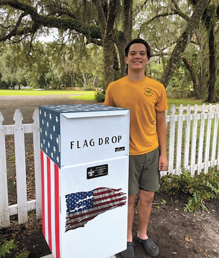 Mandarin resident Patrick Setzer has completed his Eagle Scout project with the assistance of his troop — the installation of the Flag Collection box in front of the Mandarin Community Club on Mandarin Road. Setzer said that as a younger member of the scout troop, he attended a Flag Retirement at the Mandarin Community Club and participated in the deconstruction of a flag as the speaker from Sons of the American Revolution (SAR) spoke about the history and meaning of all the parts of the US flag. He attended the Flag Retirement held at the club again in February of this year and decided to pursue the collection box as his Eagle Scout project.