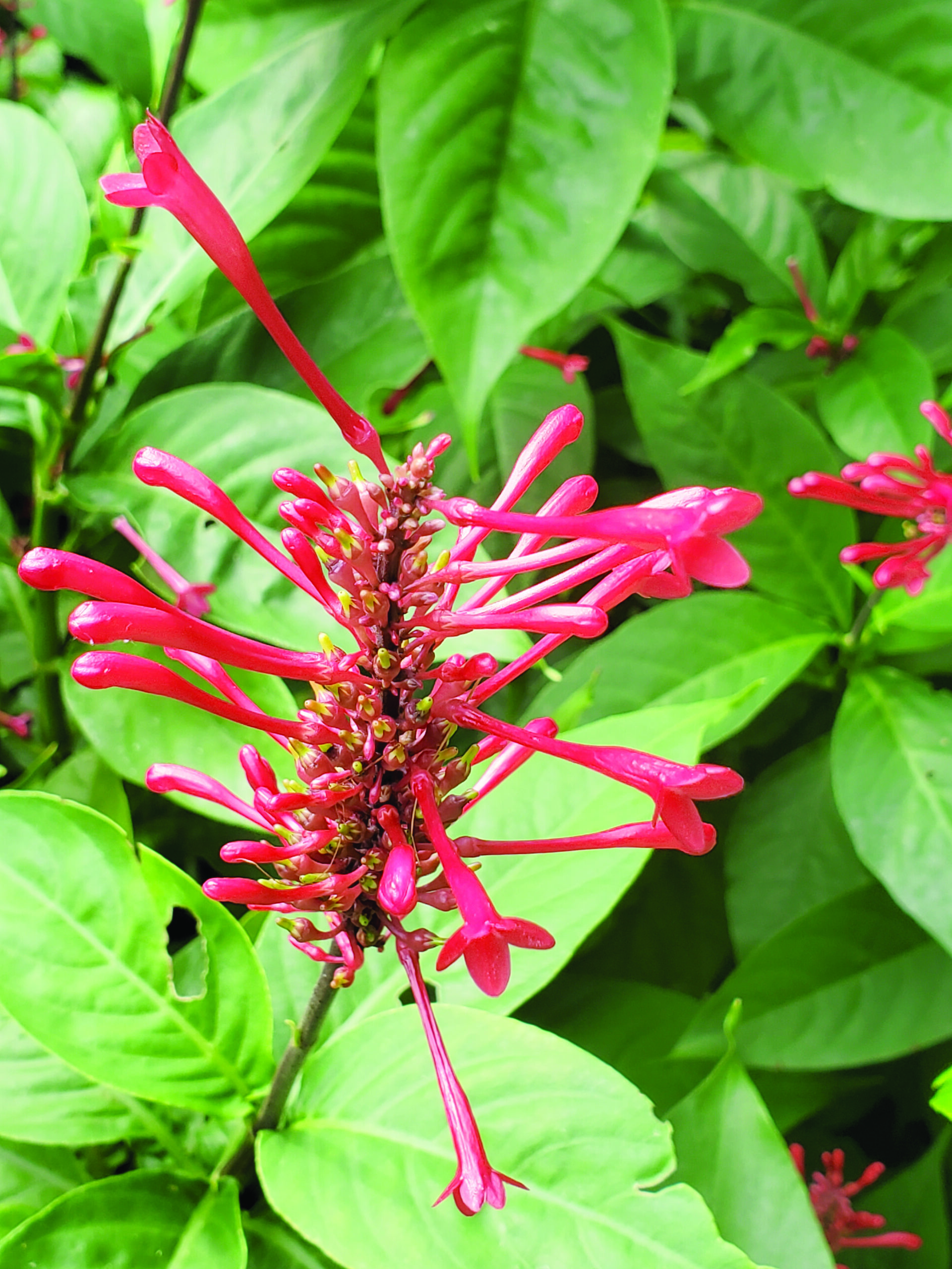 As the summer garden winds down, my patch of cardinal’s guard (Odontonema strictum) has been coming into its own. Its stunning red flower spikes are attracting hummingbirds, which chase each other around furiously, as if there aren’t enough flowers to feed them all. There are masses of firebush (Hamelia patens) flowers too, so they really don’t need to worry. There are butterflies galore because we also feed their larvae: exotic Dutchman’s pipevines (Aristolochia sp.) provide food for gold rim swallowtail caterpillars and maypop vines (Passiflora incarnata) feed the caterpillars of zebra longwings, our state butterfly, and gulf fritillaries. Add to the mix a variety of beneficial pollinators like bees, syrphid flies, wasps, small skippers, larger swallowtail butterflies, and yellow sulphur butterflies, well, the garden is never dull.