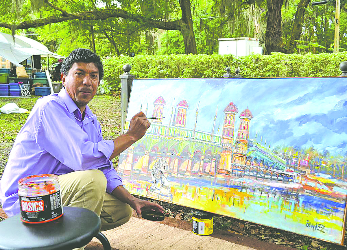 Artist Enrique Gonzalez with his painting inspired by the oak trees at the Mandarin Community Club grounds at the 2015 Mandarin Art Festival.