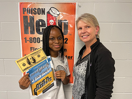 Taylor Banks from Mandarin Middle School shows Florida Poison Information Center Director Dr. Dawn Sollee her prize for winning the National Poison Prevention Week video contest for middle school students.