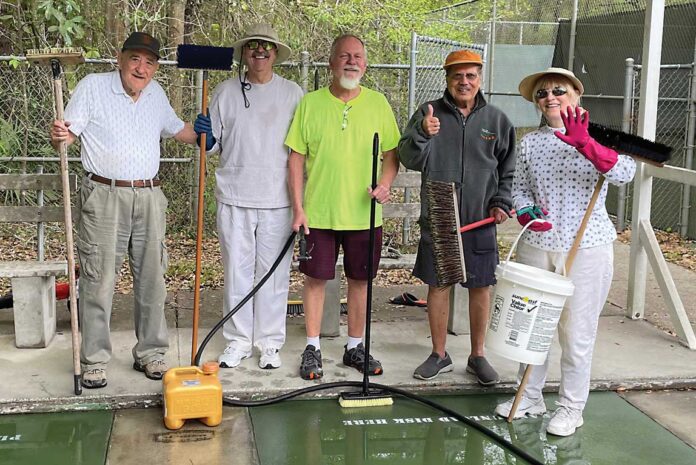 On the overcast afternoon of March 14, an intrepid cleanup crew showed up to remove the stains, mold, and dirt from the group’s beloved shuffleboard courts. Armed with hoses, buckets, brooms, and bleach they set to work scrubbing away the accumulated grime. The courts were pretty dirty and it took a good deal of scrubbing — but the end result was a great improvement! Pictured are Manuel Granados, Monster Molyneux, Jeff Schleger, Ramesh Choksi, and Annette Molyneux.