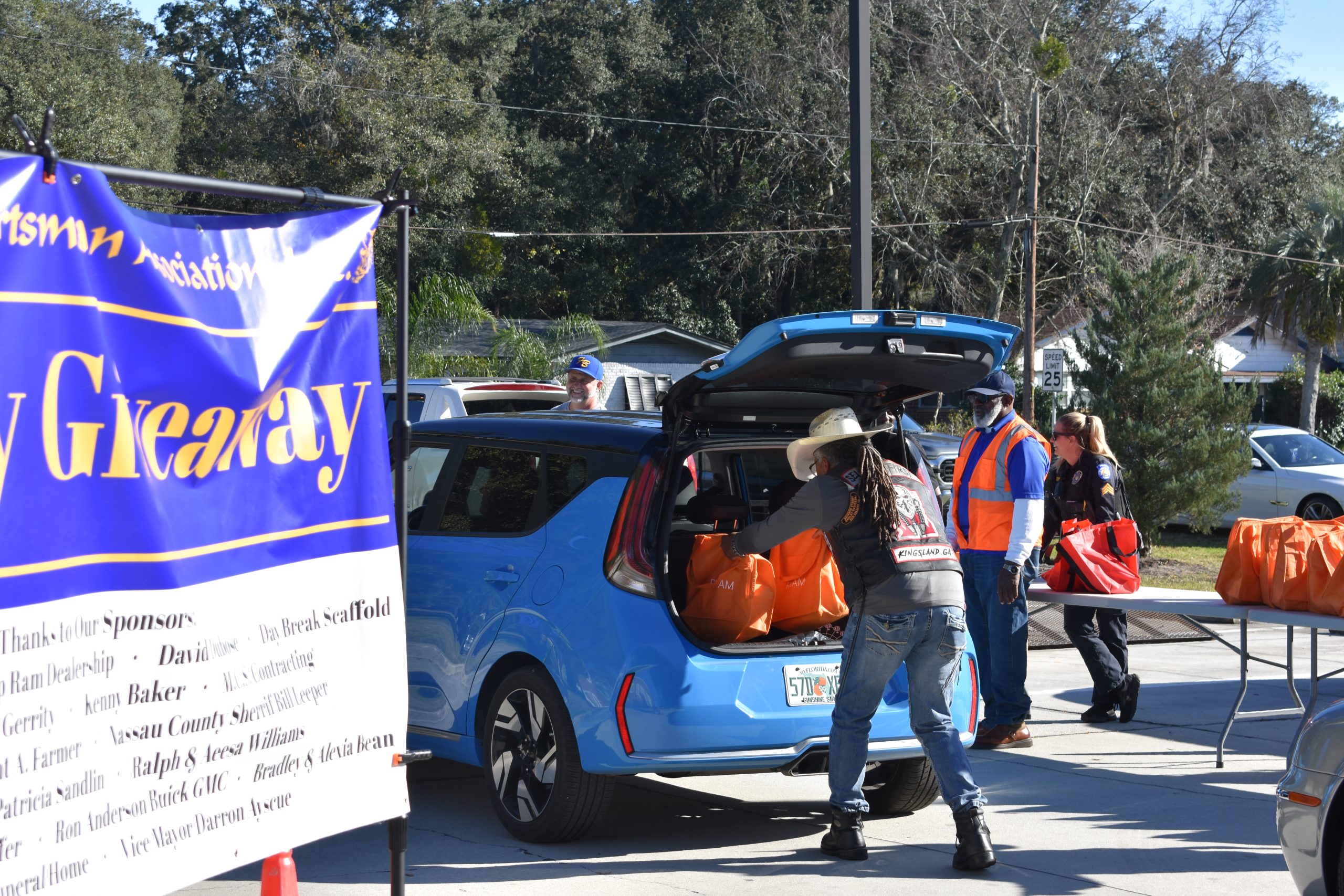 About 30 volunteers helped carry out the event, most of whom are members of the Elm Street Sportsman Association. They were helped by Fernandina Beach police officers, City Commissioner Genece Minshew and members of a Kingsland-based motorcycle club. The volunteers waved cars forward, exchanged greetings and worked to keep the drive-thru line moving steadily.