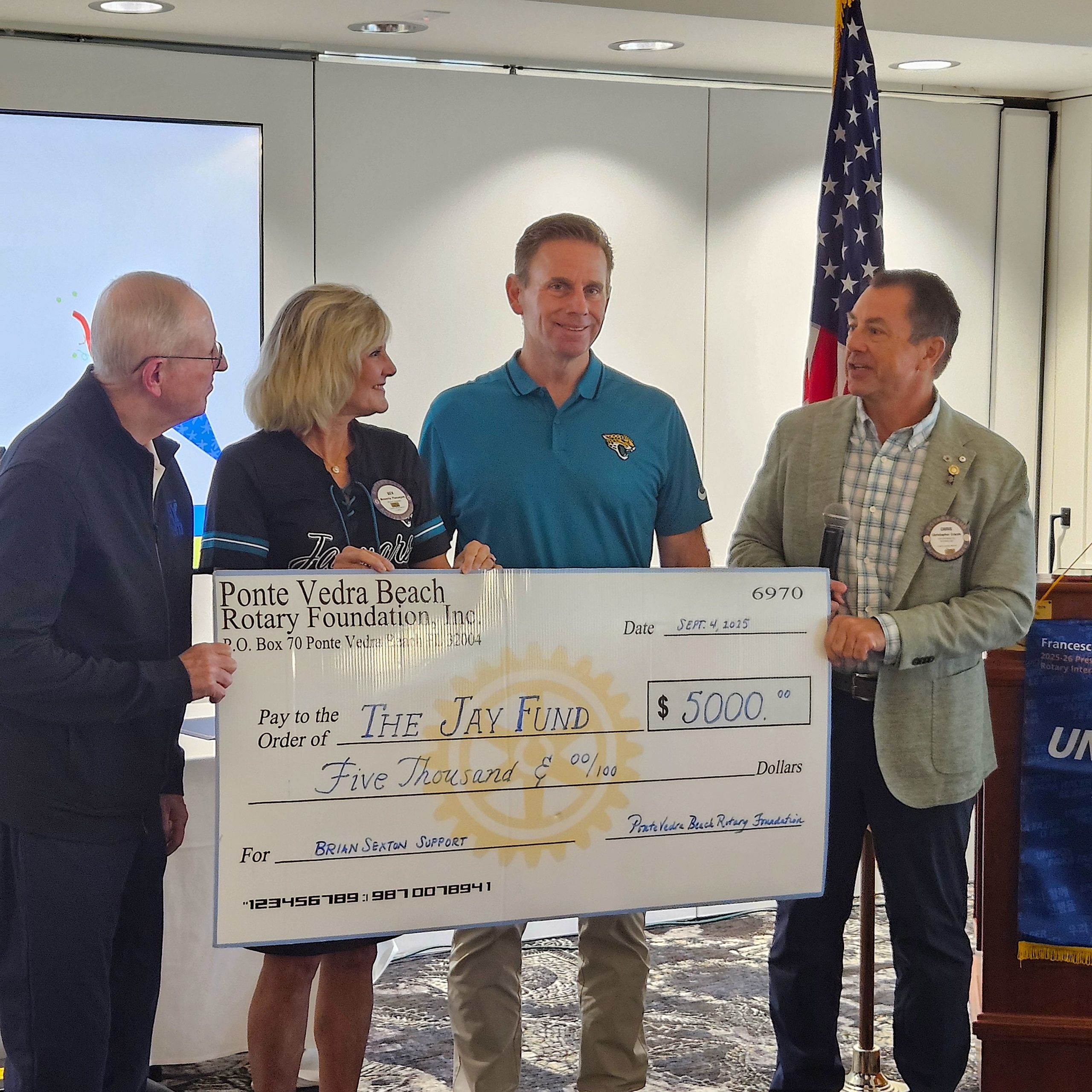 Joining him was legendary football coach Tom Coughlin, who along with Sexton, accepted a $5,000 donation from the club for the Tom Coughlin Jay Fund.