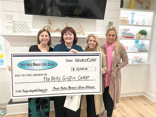 Betty Griffin Center’s Rape Crisis Unit is the recipient of the Ponte Vedra Women’s Civic Alliance’s annual grant. Betty Griffin Center’s Kelly Franklin accepted the funds from Ponte Vedra Women’s Civic Alliance board members Jodi Furr, Joan Davey, and Annemieke Holder at the alliance’s general meeting on Feb. 8. The Ponte Vedra Women’s Civic Alliance awards an annual $10,000 grant to a beaches area 501(c)3. Applications are accepted May 1 – June 30. Visit PVWCA.org for more information.