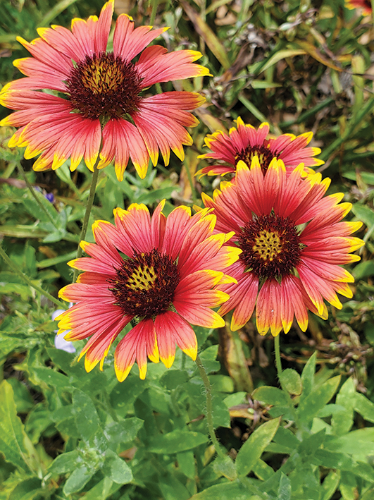 Despite the lack of rain, the front garden beds are still looking reasonably attractive – at least to my eyes. Indian blanket (Gaillardia sp.) plants are holding up well, and the cheerful red and yellow daisy-like flowers sing in the sun. There is fruit on the native Darrow’s blueberries (Vaccinium darrowii). The berries are turning dusty pink, which blends beautifully with the subtle blue green of the foliage. New shoots are delightfully pink tinged. The fruit is better suited to the birds as it’s not as luscious as our cultivated varieties, which is fine by me. I hope the birds enjoy them.