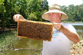 A: I just happened to Google beekeeping one day, and the more I looked into it, the more I wanted to learn. I started with one colony and built up to nine colonies, which were all lost in Hurricane Matthew. Then I built up again to seven colonies, which were lost in Hurricane Irma. Then I started up again and built up to six colonies. I buy the bees from Hives and More, a honey farm in the Fruit Cove/Switzerland area of St. Johns County. I was asked to teach a course on the hobby of beekeeping at the University of North Florida, which I have done twice. I used to give people honey, and then I sold it for a short while; however, I ran out every year, so now we just keep it for our own use. I was always more interested in making more bees to sustain for the ecology of the world than selling honey. Eighty percent of crops are inadvertently reliant on bees. Losing a whole batch of bees twice was devastating to me emotionally.
